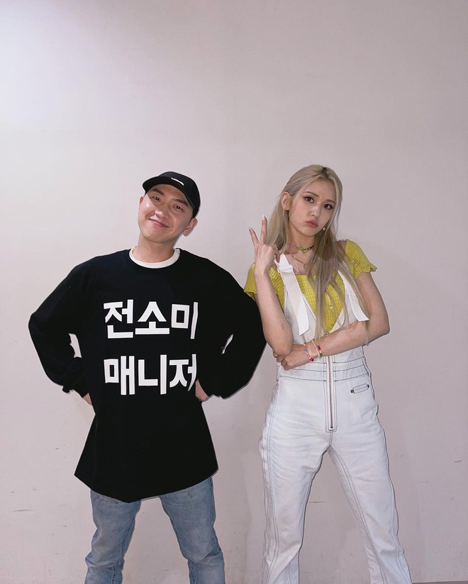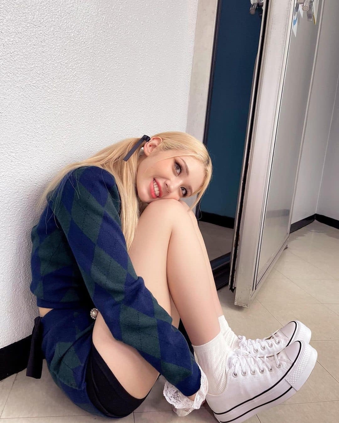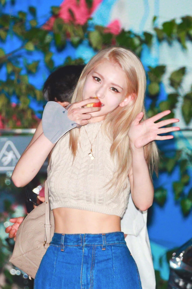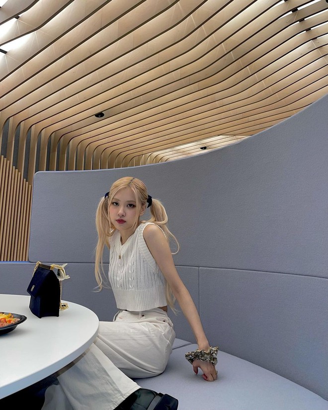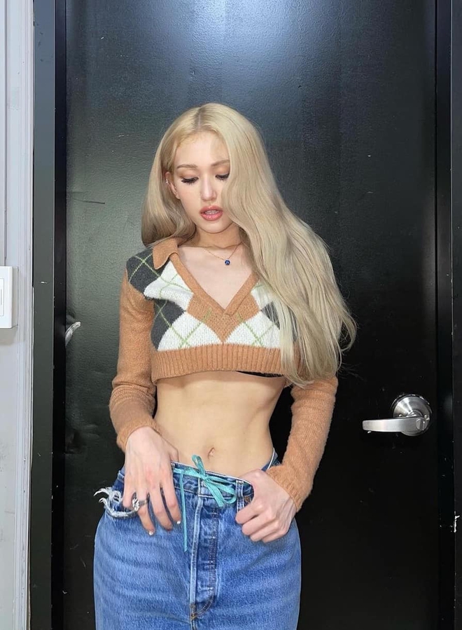 Ngoài ra, Rosé và Somi còn "tâm linh tương thông" khi cùng chọn giày trắng và nhuộm tóc vàng bạch kim, chỉ có khác ở chỗ giày của Rosé là combat boot, tóc cô nàng thì xõa tự nhiên còn Somi thì đi Converse và cột tóc hai bên