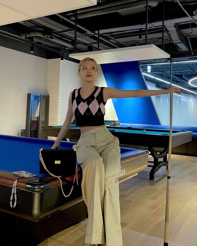 Trong khi đó Rosé vẫn trung thành với phong cách nữ tính, "soft girl". Thời gian này giọng ca chính nhà Hắc Hường tích cực lăng xê gilet len, phối cùng quần ống rộng. Thay vì dùng màu sắc chấm phá cho outfit, Rosé thường chọn trang sức màu vàng đồng hay ánh kim, kể ra thì cũng hợp với hình tượng sang trọng, trưởng thành mà Rosé đang theo đuổi nhỉ?