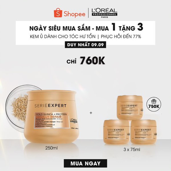 Dầu hấp nhũ vàng phục hồi hư tổn toàn diện Serie Expert Absolut Repair Gold L'Oréal Professionnel bổ sung hàm lượng dưỡng chất Keratin liều cao cùng nhũ vàng cao cấp giúp hồi sinh những sợi tóc xơ, khô; mang lại sự chắc khỏe, mềm mại cho mái tóc. Bạn nên dùng dầu hấp 1 - 2 lần/ tuần để bổ sung dưỡng chất giúp tóc luôn chắc khỏe và mềm mại.
