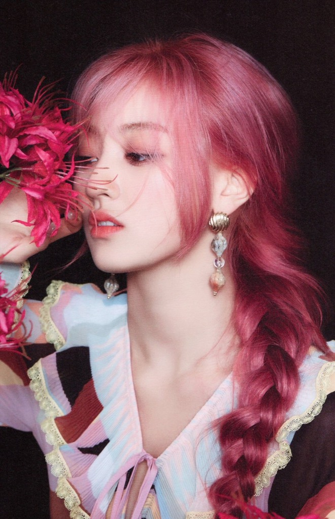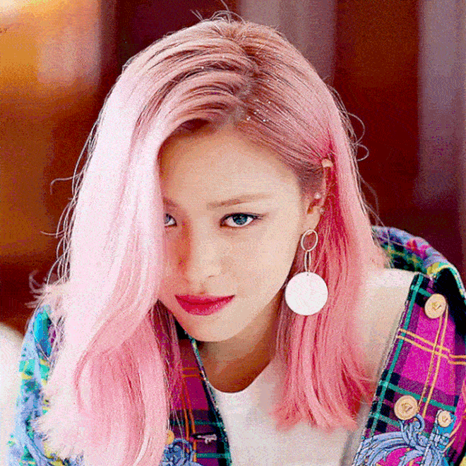 Trưởng nhóm TWICE lại đượm chút ma mị, bí ẩn trong màu tóc hồng. Đôi lúc Jihyo để màu hồng phớt, khi thì để hồng đậm ngả tím, kết hợp với tông trang điểm hồng đất ánh tím nữa thì quá chuẩn bài còn gì