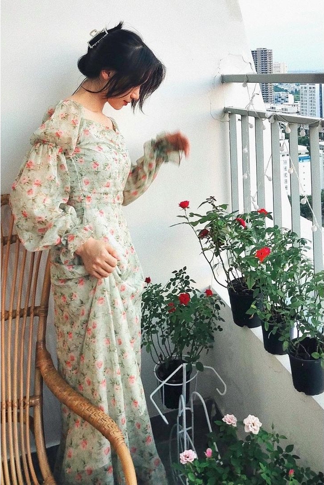Lần khác, Hòa Minzy lại xuất hiện với vẻ ngoài cực kì tiểu thư, điệu đà. Chiếc váy hoa nhí dáng dài đậm chất mùa thu được cô nàng mặc kiểu trễ vai, khoe ra xương quai xanh gợi cảm. Vẻ yểu điệu, thục nữ khi kết hợp với những chậu hoa hồng nơi ban công sao mà hợp thế không biết