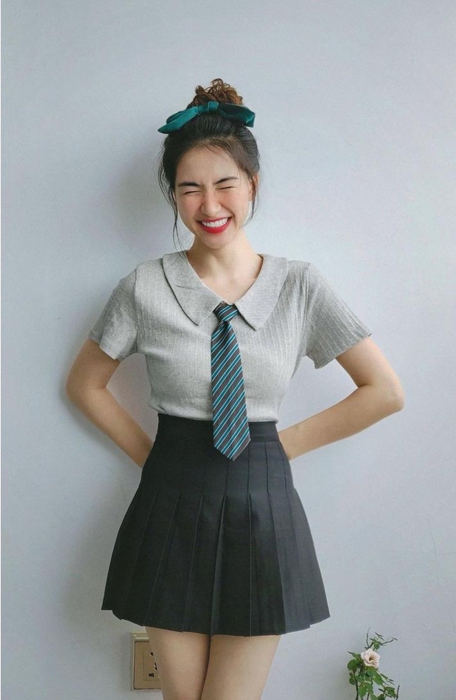 Như để kỉ niệm ngày tựu trường cách đây không lâu, Hòa Minzy bỗng xuất hiện với phong cách nữ sinh trung học năng động, trẻ trung. Nữ ca sĩ diện 1 chiếc áo len dệt kim cổ bẻ ton sur ton với màu tường, bên dưới là chân váy tennis cạp cao. Để vẻ ngoài đúng chất high teen, Hòa còn nhấn nhá thêm bằng chiếc cà vạt kẻ karo ngắn kinh điển. Gương mặt dễ thương với phấn má ửng hồng và mái tóc búi cao, trông cô cũng ra dáng học sinh lắm đó chứ