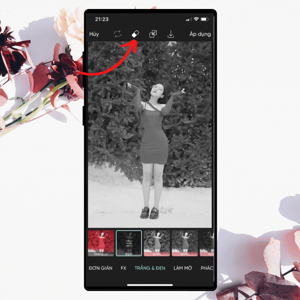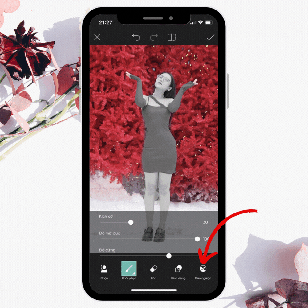 Bạn chọn mục Đảo ngược để đổi màu của chủ thể với phông nền cho nhau. Như vậy, bạn đã hô biến bức hình thành nền đen trắng nhưng chủ thể thì vẫn giữ nguyên màu gốc. Sau đó, bạn chọn biểu tượng dấu tích để Áp dụng các thao tác đã làm.